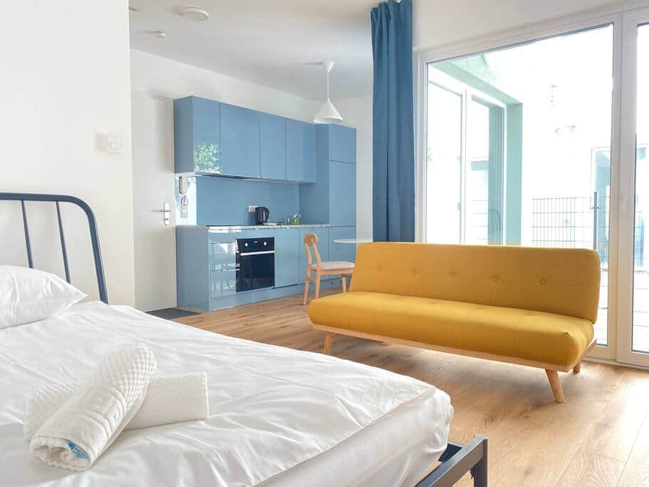 The entire studio apartment has 26 square meters and consists of one open concept space as living-, bedroom- and open kitchen area. Sleep comfortably on a queen size bed with fresh cotton sheets. The kitchen is fully equipped for you to start cooking. There is an on-suite bathroom with a shower. Additionally, you have access to a small private garden area.